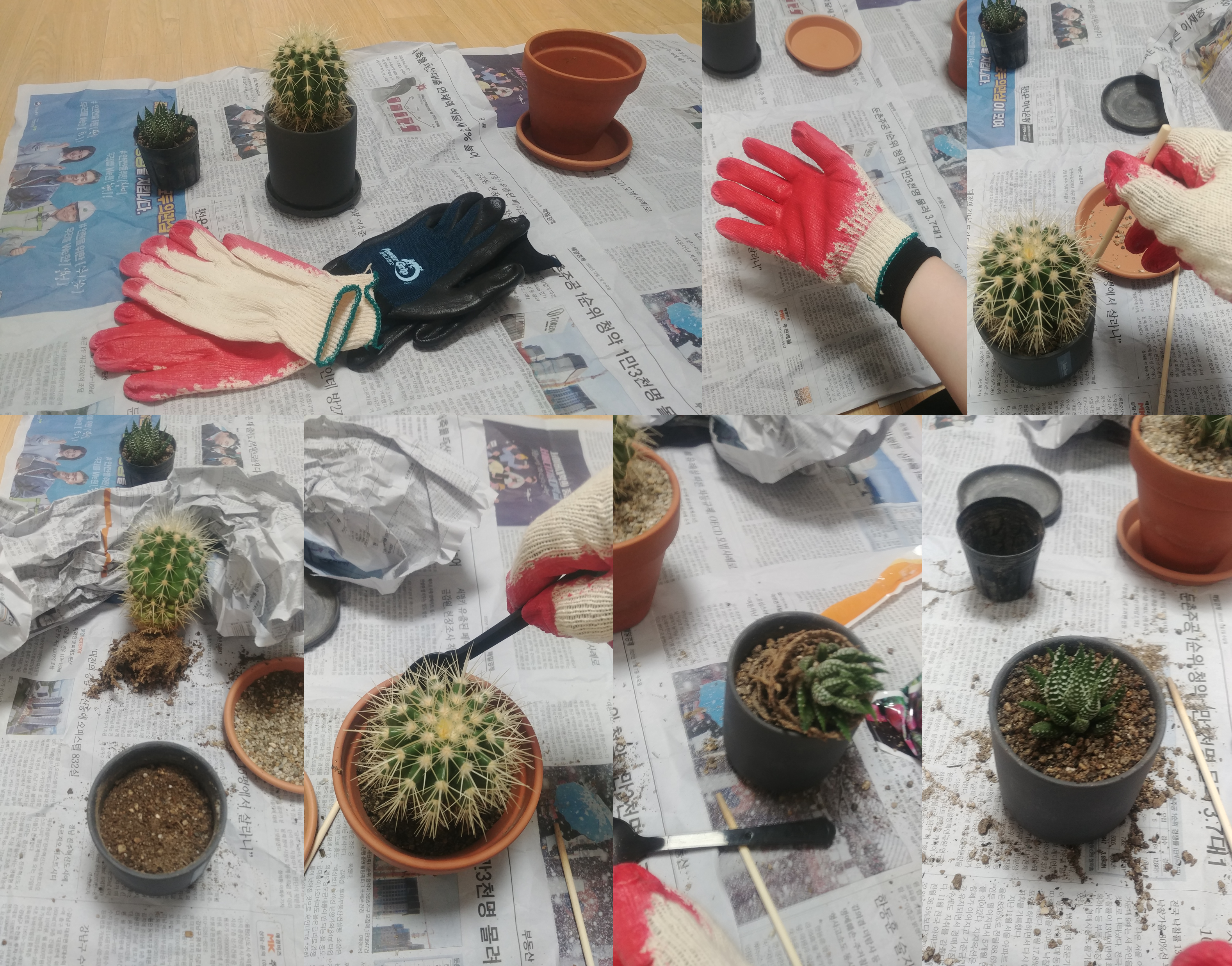 (6) 새로운 화분에 흙을 반쯤 채운 뒤, 선인장을 살살 올려두고 흙을 꽉 채워준다. 삽이 없는 관계로 일회용 숟가락으로 열심히 퍼다 옮겼다. 뿌리의 흙을 털어주는 사람도 있다던데 난 뿌리 손상이 될까 봐 걱정되어서 그냥 넣었다. 아참, 나는 저 화분을 전부 흙으로 채워버려서 들어보면 엄청 무겁다. 어차피 뿌리가 짧으니 적당히 맨 밑에는 크고 가벼운 자갈로 채우면 좋을 것 같다.