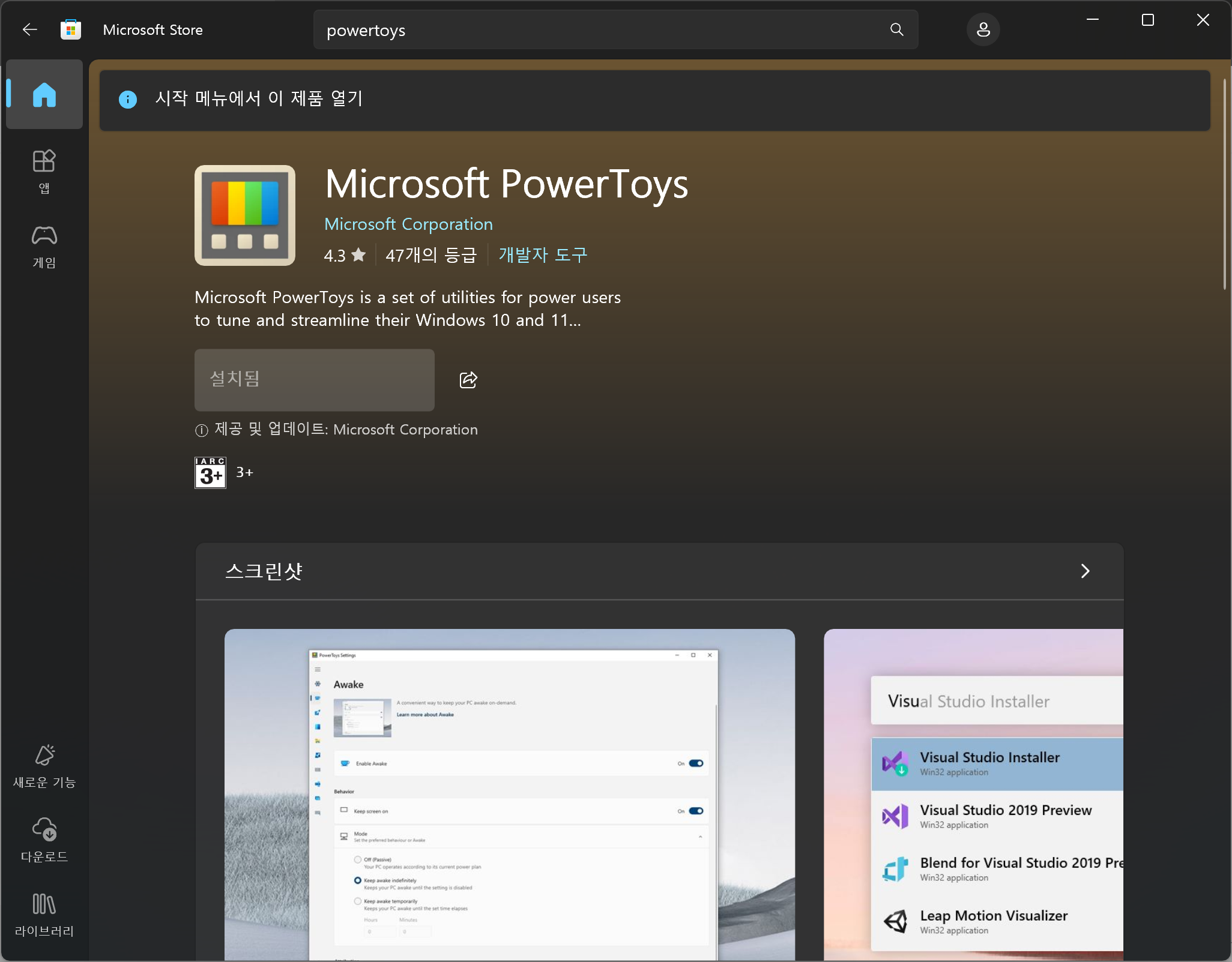 Microsoft Store에 들어가서 PowerToys라고 검색한 다음, 다운로드한다.