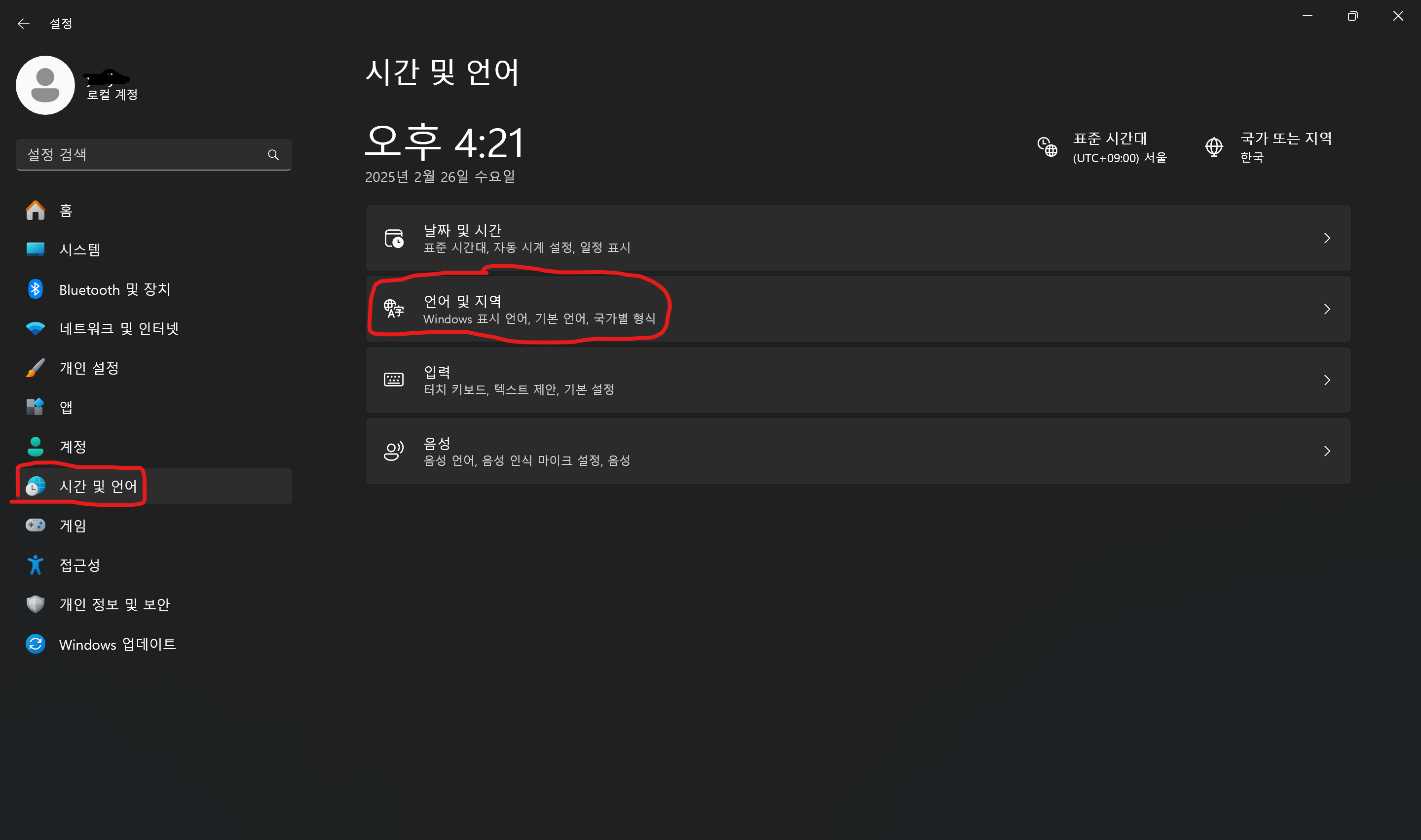 '설정 > 시간 및 언어 > 언어 및 지역'에 들어간 다음,