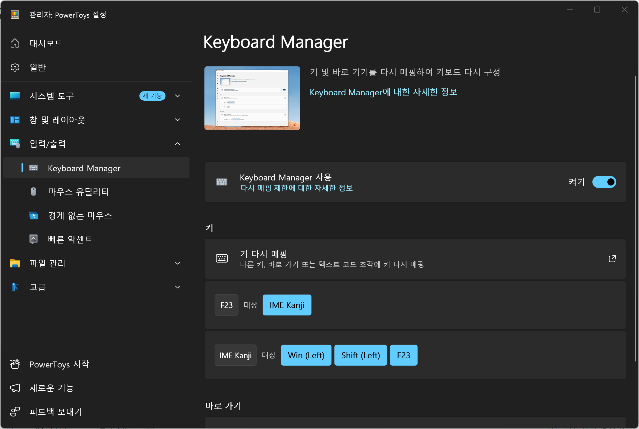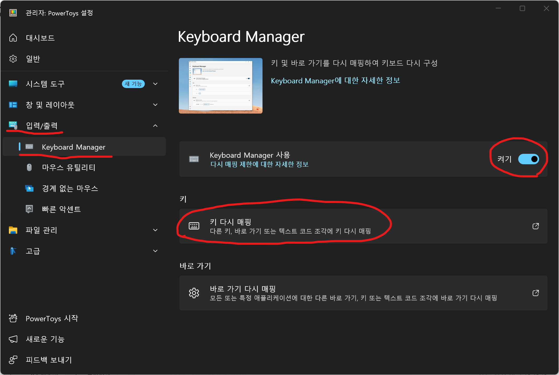 '입력/출력 > Keyboard Manager'에 들어가서 Keyboard Manager 사용을 '켜기'로 설정한 다음,