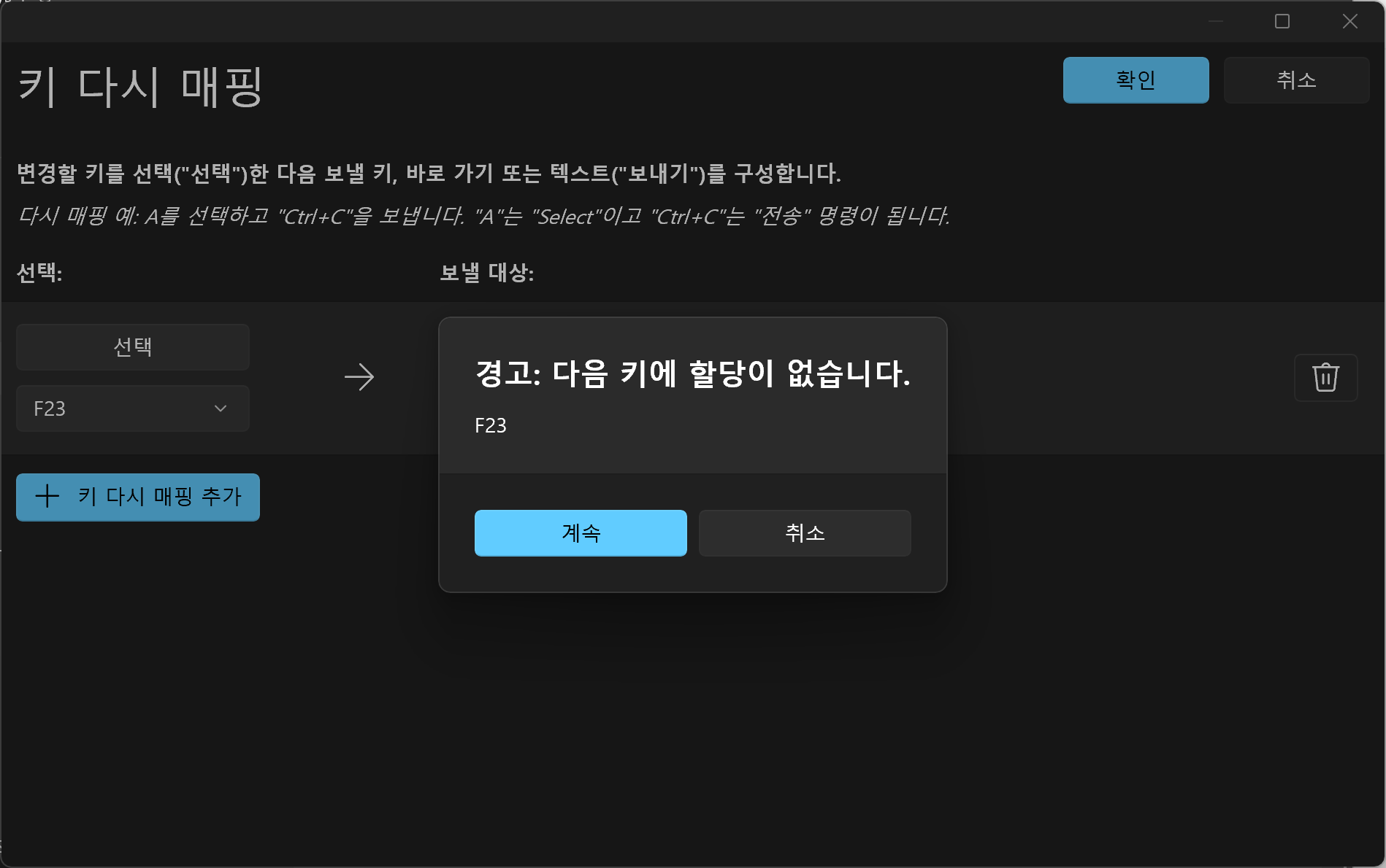 확인 버튼을 누르면 '경고: 다음 키에 할당이 없습니다'라고 뜨는데