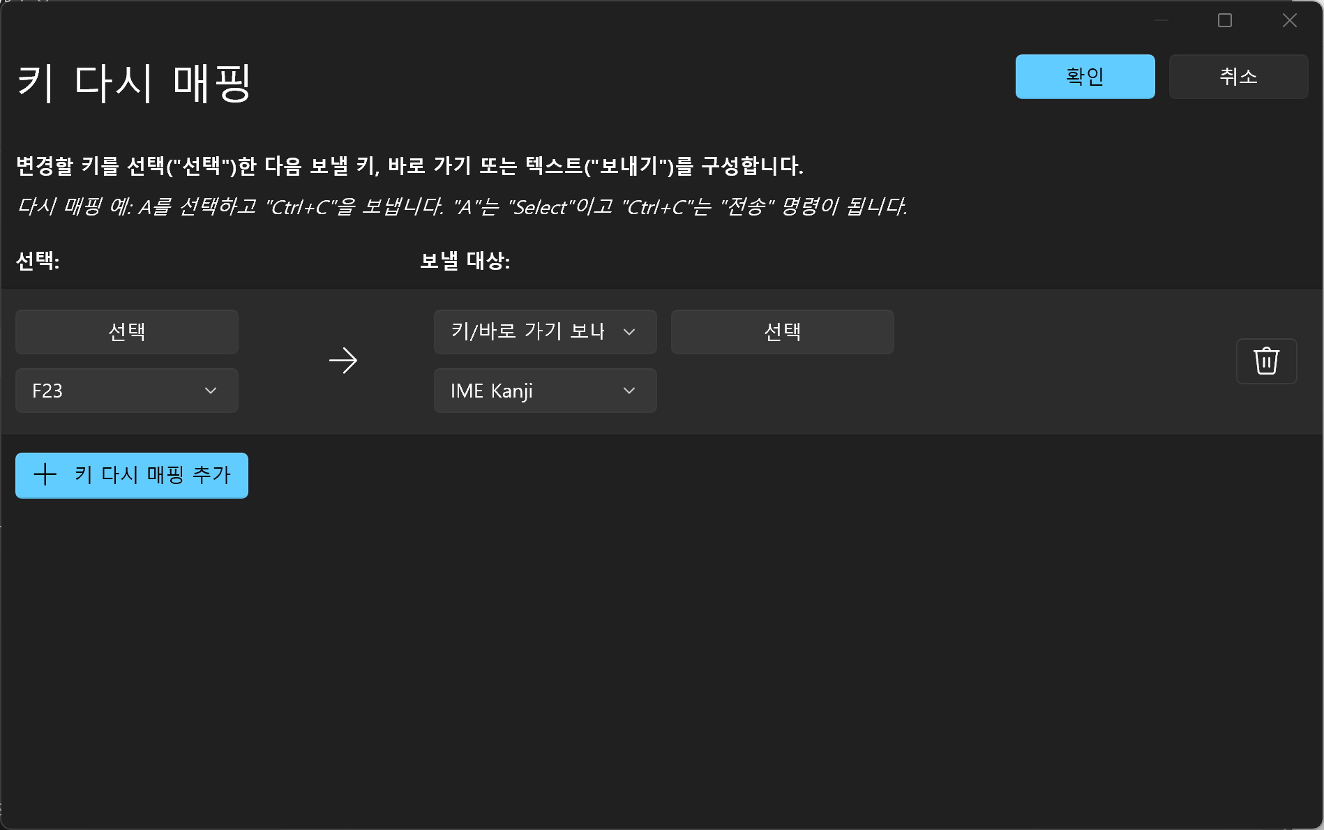 키 매핑을 추가해서 아래 캡처화면처럼 IME Kanji를 매핑해주면 된다.
