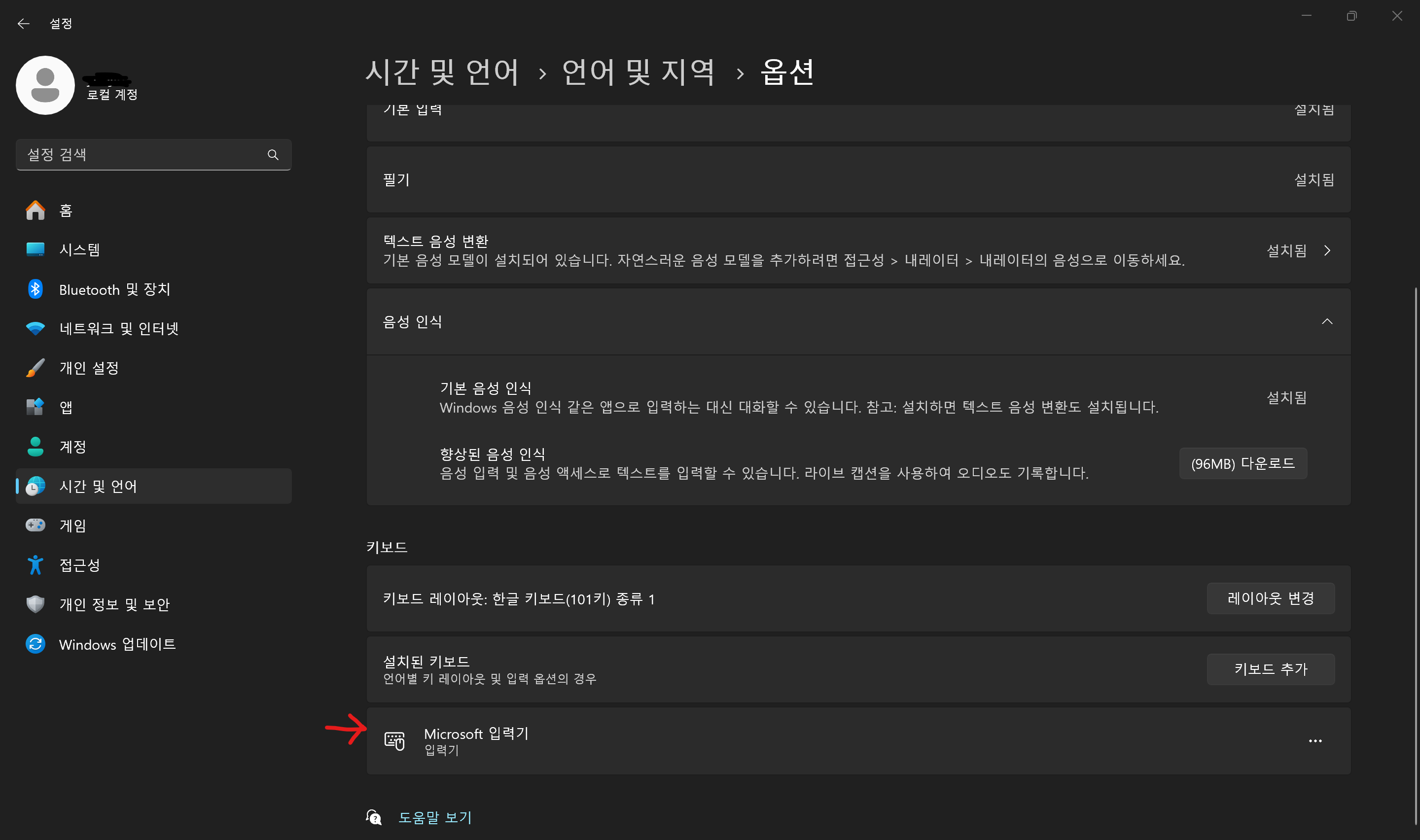 이때, 설치된 키보드에는 'Microsoft 입력기'가 있어야 하고,